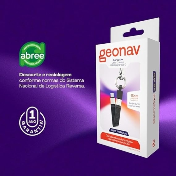 Cabo USB-C para USB-C 4.0 Geonav, TIPO Chaveiro, em TPE Flexível, 13cm, 240W, UCC11SHBK