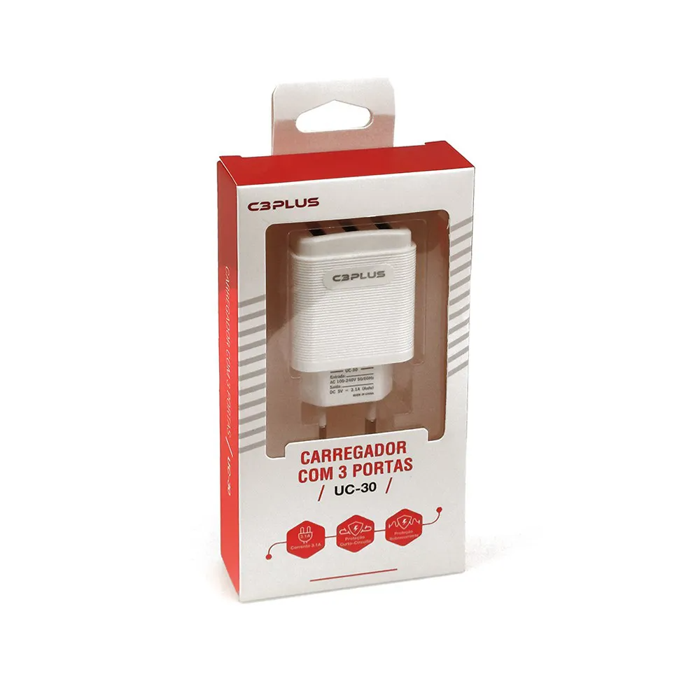 Carregador Universal AC/USB UC-30WHX C3Plus Recarregue de forma prática os mais diversos dispositivos eletrônicos com o carregador UC-30. Carregue com eficiência até 3 dispositivos simultaneamente com bivolt automático, corrente máxima de 3.1 amperes e tomada padrão NBR 14136. Oferece ainda proteção contra curto-circuito e sobre corrente.Características:• cor: Branco;• Carregador USB;• 3 Portas USB;• Tomada Padrão NBR 14136;• Plástico ABS;• Saída: 3 Porta USB;• Corrente (Max) 3.1 Amperes;• Tensão 5Volts.• Entrada: Bivolt automático;• Entrada 100~240V;• Frequência: 50/60Hz.• Proteções: Contra Sobre Corrente; contra Curto-Circuito. Conteúdo da Embalagem:• Carregador AC/USB UC-30• Cabo não incluso• Altura da embalagem: 16 CM• Largura embalagem: 2,9 CM• Comprimento embalagem: 8,4 CM• Peso embalagem: ,06 KG• Part Number/SKU: UC-30WH• EAN do produto: 7898555216532