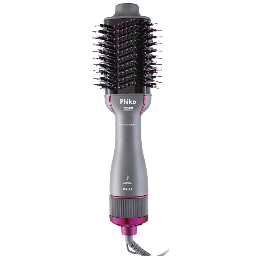 Ao comprar este item, o consumidor está ciente e concorda que se trata de um produto de outlet, podendo apresentar pequenas avarias, tais como: desgaste tampográfico, riscos, marcas, manchas e/ou amassados, embalagem avariada ou reembalados/sem a caixa original, entretanto, com a sua funcionalidade em perfeito estado. A garantia do produto não cobrirá as avarias acima citadas. Oferta enquanto durar o estoque.Escova Secadora Philco Soft Advance PES14 4 em 1 Bivolt é 4 em 1. Seca, alisa, modela e dá volume com Tecnologia Infrared que evita danos aos fios auxiliando na hidratação selando as cutículas e fortificando os fios para que cresçam saudáveis. Ela também possui Tecnologia Pure Hairbrush, que são cerdas macias e de material natural que não agride os cabelos e proporciona mais brilho. Os Ìons Tourmaline da Escova Secadora liberam íons negativos que eliminam a estática gerando maciez e eliminando o frizz, mantendo a umidade natural dos fios evitando ressecamento e deixando os cabelos brilhosos.São 1300W de potência em um único produto e bivolt, perfeita para levar em qualquer lugar. Tudo isso em 3 temperaturas e 2 velocidades para combinar com todos os tipos de cabelos. O revestimento em cerâmica garante maior alcance de altas temperaturas e muito mais rápida. As aberturas de ventilação auxiliam na passagem de calor, proporcionando uma secagem mais rápida e eficaz.• Cerdas de Javali• Luz infravermelha• Bivolt manual• 1300W em 220V e 1200W em 127V• 3 temperaturas disponíveis• 2 velocidades• Cordão giratório• Cordão elétrico com 1,80M• Libera tourmaline íons• Tubo com revestimento em cerâmicaDIMENSÕES E PESO:Altura: 84 mmLargura: 107 mmProfundidade: 405 mmPeso: 600 g