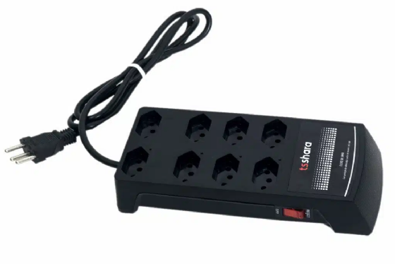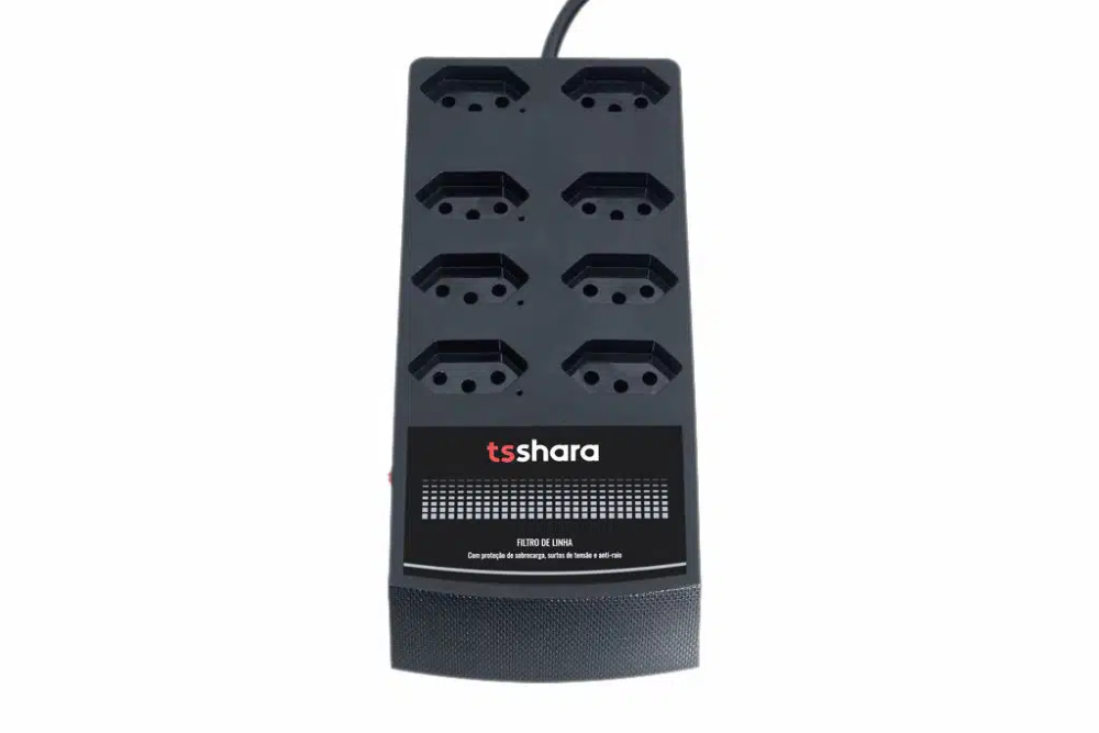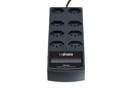 FILTRO DE LINHA PROTETOR ANTI RAIO 8 TOMADAS 10A BIVOLT - TS SHARAFiltro de Linha + Protetor DPSMais segurança e praticidade para seus equipamentos!Com 8 tomadas disponíveis, sendo 2 tomadas com maior espaçamento para uso com fontes maiores, você conecta seus aparelhos de forma organizada e eficiente. Todas as entradas possuem tripla proteção, garantindo maior segurança contra sobrecargas, picos de tensão e atenuador de ruídos.O produto conta com disjuntor térmico rearmável, que dispensa a troca de fusível e pode ser religado facilmente em casos de sobrecarga ou curto-circuito — proporcionando mais economia, durabilidade e tranquilidade no uso diário.Com design compacto e leve, pode ser instalado de forma horizontal (mesa) ou vertical (parede), em diferentes ambientes residenciais ou comerciais, protegendo seus equipamentos contra anomalias na rede elétrica.CARACTERÍSTICAS GERAISTipo: Filtro de linha / Protetor elétricoAplicação: Proteção de equipamentos eletrônicos contra surtos e sobrecargasGabinete: PlásticoGarantia: 2 anosDESEMPENHOPotência máxima em 127V: 1270 WPotência máxima em 220V: 2200 WCorrente máxima: 10AFrequência: 50Hz / 60HzTensão máxima: 250VALIMENTAÇÃOTensão de entrada: 127V / 220V (bivolt)Tensão de saída: 127V / 220VCONECTIVIDADEEntrada: Cabo tripolar PP 3 x 0,75 mmComprimento do cabo: 1,5 metro (NBR NM-247-5)Saídas: 8 tomadas 10A (NBR 14136)RECURSOSChave liga/desliga com disjuntorIndicador luminoso na chave: SimProteção contra sobrecarga: SimProteção contra surtos: Varistor 300V, 220J (10/1000us)Pico de corrente: 6500A (8/20us)DPS classe III unipolar: 10AAtenuação de ruídos: EMI e RFIAMBIENTEUso internoDIMENSÕES E PESOAltura: 40 mmLargura: 100 mmProfundidade: 225 mmPeso: 0,324 kgITENS INCLUSOS1 Filtro de linha 8 tomadas