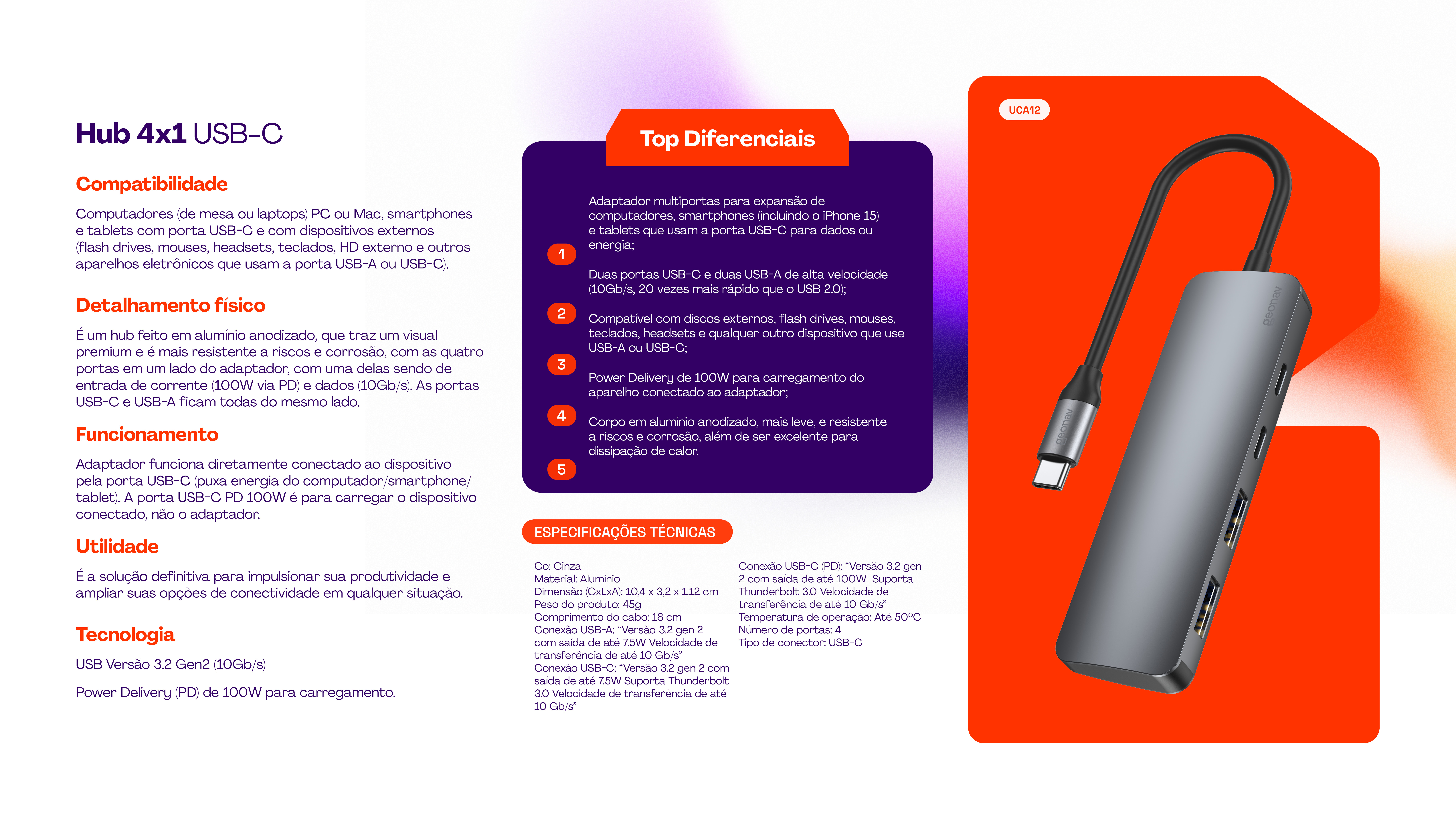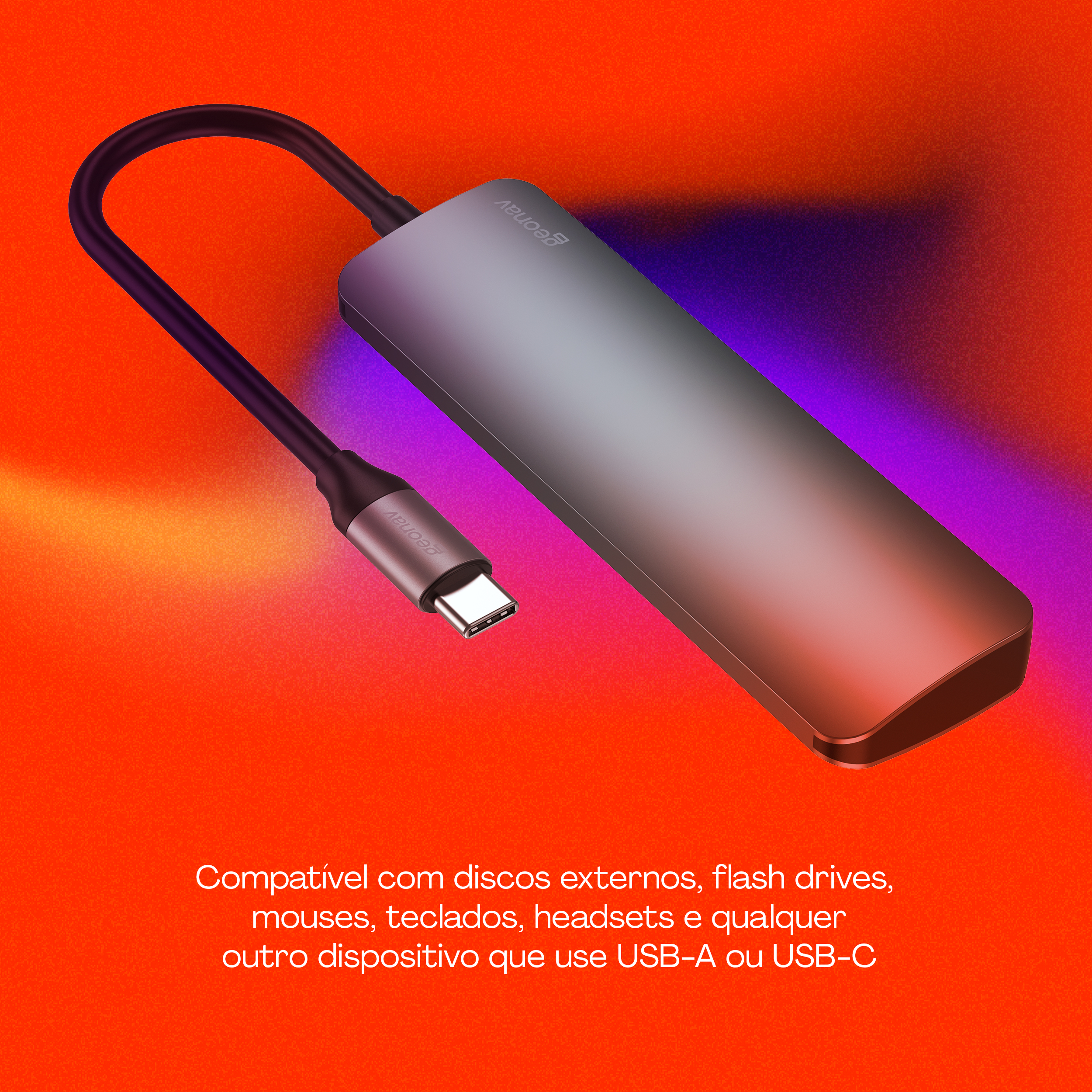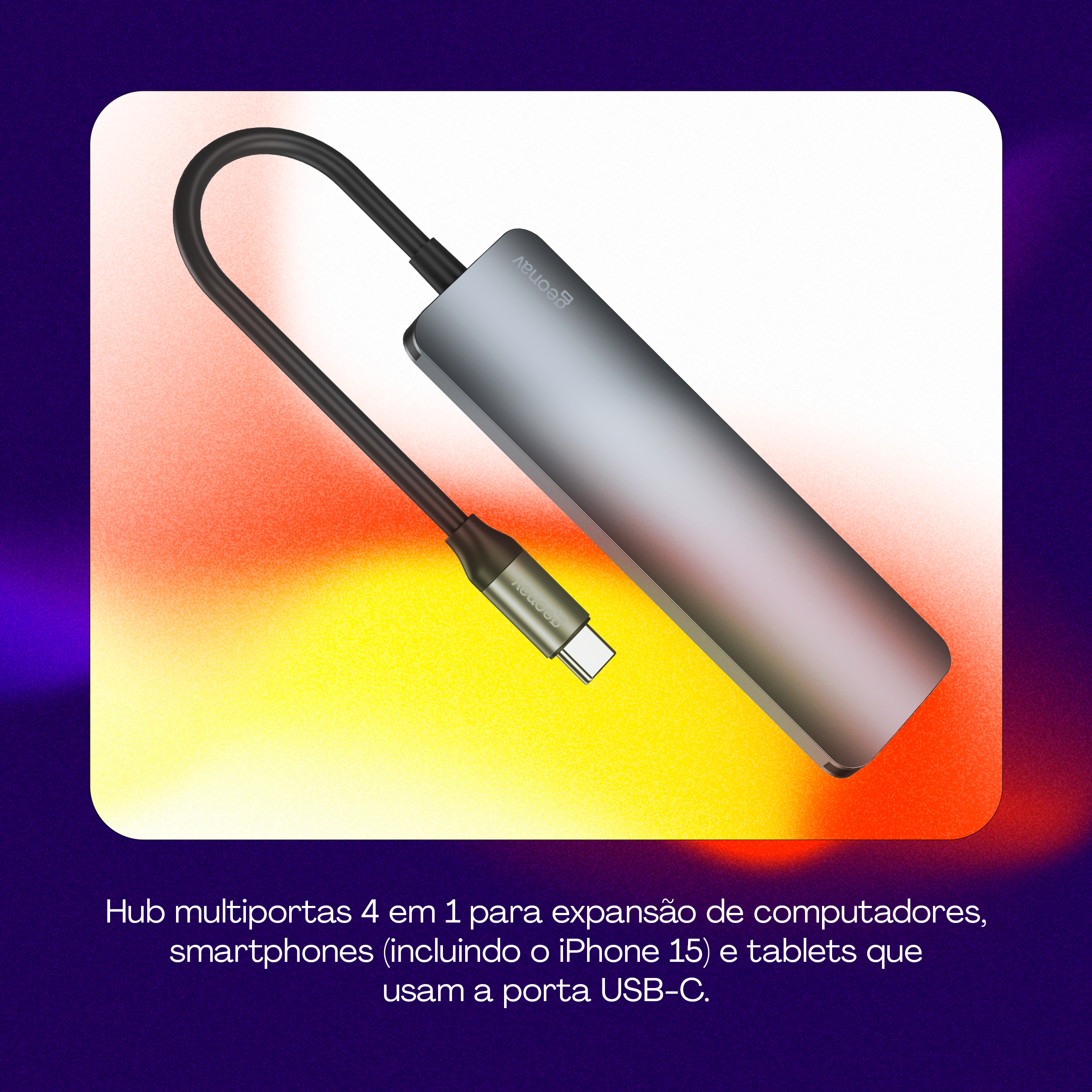 O Hub 4x1 USB-C aumenta a capacidade do seu dispositivo sem deixar faltar energia. Com duas portas USB-C e duas USB-A, todas com alta velocidade de transferência de dados (10Gb/s, 20 vezes rápido que o USB 2.0), você poderá gravar vídeos, áudios e qualquer tipo de arquivo diretamente em uma mídia externa rapidamente. E não se preocupe: a porta USB-C com Power Delivery de 100W vai permitir carregar seus aparelhos em qualquer situação.Principais Características:• Adaptador multiportas para expansão de computadores, smartphones (incluindo o iPhone 15) e tablets que usam a porta USB-C para dados ou energia;• Duas portas USB-C e duas USB-A de alta velocidade (10Gb/s, 20 vezes mais rápido que o USB 2.0);• Compatível com discos externos, flash drives, mouses, teclados, headsets e qualquer outro dispositivo que use USB-A ou USB-C;• Power Delivery de 100W para carregamento do aparelho conectado ao adaptador;• Corpo em alumínio anodizado, mais leve, e resistente a riscos e corrosão, além de ser excelente para dissipação de calor.• Porta USB-C com PD também transfere dados em alta velocidade;• Design compacto e portátil, fácil de transportar para qualquer lugar;• Versátil e prático pois traz portas USB-C, mais modernas, mas também as tradicionais USB-A;• Conexão simultânea de até quatro dispositivos externos diferentes;• Compatível para gravação de vídeos no formato Pro Res do iPhone 15.ESPECIFICAÇÕES TÉCNICAS:• Cor: Cinza• Tamanho: Único• Comprimento do item: 10,4 cm• Largura do item: 3,2 cm• Altura do item: 1,12 cm• Peso do item: 45g• Comprimento do cabo: 18cm• Formato do item: Adaptador multi conexões• Comprimento da embalagem: 2,5 cm• Largura da embalagem: 7 cm• Altura da embalagem: 16 cm• Peso da embalagem: 73g• Quantidade de itens dentro de cada embalagem: 1 Hub 4x1 USB-C e 1 manual do usuário• Matéria prima do item: Alumínio• Fonte de energia: Energia elétrica DC• Tensão de entrada: Até 20V• Corrente de entrada: 5A• Potência de entrada: Até 100W• Tensão de saída: Até 20V• Corrente de saída: 5A• Potência de saída: Até 100W (Power Delivery) • Descrição de saída: Usando apenas a saída: USB-C (PD): Tensão de até 20V com corrente máxima de 5A e entrega até 100W com a tecnologia Power Delivery.• usando simultaneamente todas as saídas: Potência total de 92W sendo que a porta USB-A e USB-C suportam no máximo 7.5W em cada saída.• Unidade de tensão: Volt• Unidade de corrente: Ampere• Unidade de potência: Watt• Consumo em repouso: Não se aplica• Temperatura de operação: Até 50°C• Número de portas: 4• Tipo de conector: USB-C