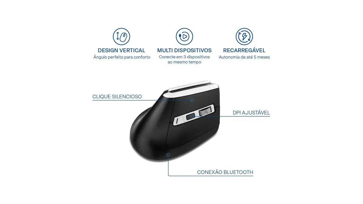 MOUSE S/FIO MULTILASER, ERGONÔMICO, VERTICAL, BLUETOOTH, USB, 3200 DPI AJUSTÁVEL, 6 BOTÕES, MS900(#)