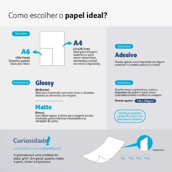 O Papel Fotográfico Glossy Multilaser A4 200G fornece alta definição em suas impressões e com secagem instantânea.Feito para ser resistência à água, possui acabamento em alto brilho para uso em todos os tipos de impressoras jato de tinta.Conteúdo da EmbalagemPapel Fotográfico Glossy A4 200g, 50 FolhasFormato A4Tipo de Produto Papel para impressãoTamanho das Folhas 21,0 X 29,7 cmAcabamento GlossyQuantidade de Folhas 50Cor BRANCOPeso do produto 200gLargura do produto 34.39cmAltura do produto 24.81cmComprimento do produto 1.1cm