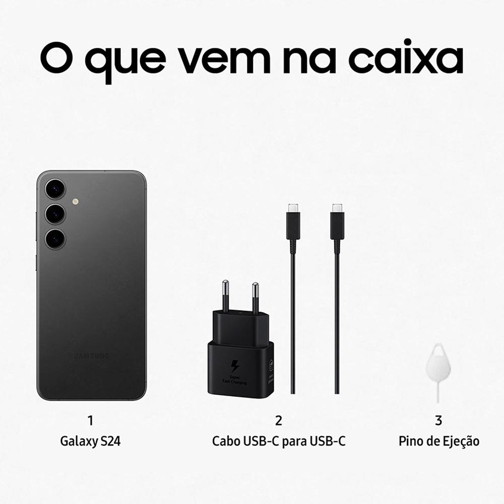 - Principais CaracterísticasGalaxy AI;Circule para pesquisar;Tradução simultânea de voz e texto por IA;Câmera Tripla Traseira de 50MP +12MP + 10MP;Selfie de 12MP Dual Pixel AF Galeria Inteligente;Tela Infinita de 6.2" 1-120Hz;256GB de Memória Interna e 8GB RAM;Bateria de 4000mAh;Dual Chip / eSIM;Cadeado Galaxy;Proteção IP68- DIMENSÕESDimensões do Aparelho (mm) - 70.6 x 147 x 7.6 mmPeso do Aparelho (g) – 167Dimensões da Caixa Unitária (mm) - 165 x 89 x 55Peso da Caixa Unitária (g) – 368- MEMÓRIAMemória Interna total compartilhada - 256GBSuporte a Cartão de Memória - NãoMemória RAM - 8GBMemória RAM Plus - até 8GB- PROCESSADORModelo do Processador - Samsung Exynos 2400Velocidade do Processador - Até 3.2 GHz- BATERIA & CARREGAMENTOCapacidade da Bateria (mAh) - 4000mAhTipo de Bateria - Ions de LítioVoltagem - Bi-VoltCompatível com Carregamento Rápido – SimCarregamento Sem Fio – Sim- CÂMERA TRASEIRAResolução - 50MP +12MP + 10MPAbertura - F1.8 + F2.2 + F2.4Zoom - Zoom Digital até 30x e Óptico 3xEstabilizador Óptico de Imagem (OIS) – SimSensor Phase Detection (PDAF) – SimFoco Automático (AF) – SimFlash - Flash-LED- CÂMERA FRONTALResolução - 12MP Abertura - F2.2 Flash Frontal - Sim, na tela- VÍDEOFormatos Suportados para reprodução - MP4,M4V,3GP,3G2,AVI,FLV,MKV,WEBMResolução de reprodução - UHD 8K (7680 x 4320) / @60fpsResolução de gravação - UHD 8K (7680 x 4320) / @30fpsFormato suportado de Streaming - 3GP,MP4,MP3- CONECTIVIDADEBluetooth - Bluetooth v5.3Browser - Google / Chrome; Samsung / S-Browser 19.0 Conexão Wi-Fi - 802.11 a/b/g/n/ac/ax 2.4G+5GHz+6GHz, HE160, MIMO, 1024-QAMRoteador Wi-Fi - Sim NFC - SimSAMSUNG Pay - Sim2 Chips - SimTipo de SIM - Nano-SIM (4FF) / eSIM USB - USB 3.2 Gen 1 USB Conector - USB Type-C- DISPLAYTecnologia - Dynamic AMOLED 2XTaxa de atualização - 1-120HzTamanho do Display - 6.2" / 153.9mmNúmero de Pixels - 1080 x 2340 (FHD+)Quantidade de Cores - 16MVidro Reforçado – Sim- SENSORESTipos de Sensores - Acelerômetro, Giroscópio, Sensor Geomagnético, Proximidade, Luminosidade, Sensor Hall, BarômetroSegurança - Leitor de impressão digital, Reconhecimento Facial- BANDAS2G GSM (GPRS/EDGE) - GSM850,GSM900,DCS1800,PCS19003G Bandas - B1(2100),B2(1900),B4(AWS),B5(850),B8(900)4G Bandas - B1(2100),B2(1900),B3(1800),B4(AWS),B5(850),B7(2600),B8(900),B12(700),B13(700),B17(700),B18(800),B19(800),B20(800),B25(1900),B26(850),B28(700),B66(AWS-3)5G Bandas FDD: N1(2100),N2(1900),N3(1800),N5(850),N7(2600),N8(900),N12(700),N20(800),N25(1900),N28(700),N66(AWS-3) TDD: N38(2600),N40(2300),N41(2500),N77(3700),N78(3500)- RADIORádio FM – NãoGravação de Rádio FM – NãoRDS – Não- GPSGPS - SimA-GPS – Sim- B2B SolutionsEAS IT Policy - 7.0MDM - Android / 6.10ODE (On Device Encryption) – SimVPN – TBCKNOX - Android / 3.10- FORMATO E INTERFACEFormato do Aparelho - Barra / SmartphoneInterface com o Usuário - Touch Screen - SISTEMA OPERACIONALSistema Operacional + Versão - Android / 14.0Plataforma - 64bitLoja de Aplicativos - Play Store / Galaxy Apps- PPBPortaria de Habilitação da Samsung a ter benefícios da Lei da Informática - 107, de 17/3/2004 DOU 18/3/2004- NCMNCM - 8517.13.00- AnatelCertificado Anatel - 20390-23-00953- PRODUÇÃOOrigem – Nacional - ACESSÓRIOSAparelho celular, carregador, cabo USB, Extrator de Chip e manual do usuário