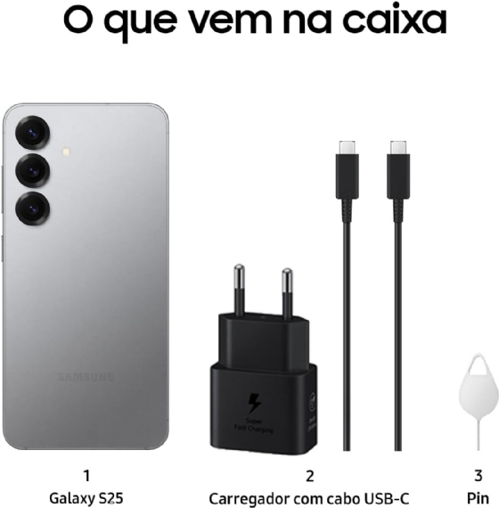 PRINCIPAIS CARACTERISTICAS:• Galaxy AI;• Tela Grande de 6.2” FHD+ Dynamic AMOLED 2X, 1-120Hz **;• Câmera Tripla Traseira de 50MP (Wide) + 12MP (Ultra Wide) + 10MP (Tele);• Câmera Frontal de 12MP;• Pagamento por aproximação com NFC (Samsung Wallet);• Até 6 atualizações de Android e 6 anos de atualização segurança;• Certificação IP68 (Resistência Poeira e Água) ***• Processador Qualcomm Snapdragon 8 Elite for Galaxy (3nm);• 256GB de Memória Interna* e 12GB RAM;• Bateria de longa duração 4.000 mAh e Carregamento rápido;• Leitor de Impressão de Digital na tela; PROTEÇÃO:• Proteção IP: IP68 (Resistência Poeira e Água) ***ARMAZENAMENTO:• Memória Interna total compartilhada: 256GB (*) • Suporte a Cartão de Memória: Não • Memória RAM: 12GB• Memória RAM Plus: até 8GB PROCESSADOR:• Modelo do Processador: Qualcomm Snapdragon 8 Elite for Galaxy (3nm) • Velocidade do Processador: Até 3.3 GHzBATERIA & CARREGAMENTO:• Capacidade da Bateria (mAh): 4000 mAh • Tipo de Bateria: Ions de Lítio • Voltagem: Bi-Volt • Compatível com Carregamento Rápido: Sim • Carregamento Sem Fio: Sim CÂMERA TRASEIRA:• Resolução: 50MP (Wide) + 12MP (Ultra Wide) + 10MP (Tele) • Abertura: F1.8 + F2.2 + F2.4 • Zoom: Zoom Digital até 30x e Óptico 3x • Estabilizador Óptico de Imagem (OIS): Sim • Sensor Phase Detection (PDAF): Sim • Foco Automático (AF): Sim • Flash: Flash-LEDCÂMERA FRONTAL:• Resolução: 12MP • Abertura: F2.2 • Flash Frontal: Sim, na tela VÍDEO:• Formatos Suportados para reprodução: MP4,M4V,3GP,3G2,AVI,FLV,MKV,WEBM • Resolução de reprodução: UHD 8K (7680 x 4320) / @60fps • Resolução de gravação: UHD 8K (7680 x 4320) / @30fps• Formato suportado de Streaming: 3GP,MP4,MP3 CONECTIVIDADE:• Bluetooth: Bluetooth v5.3• Browser: Google / Chrome; Samsung / S-Browser 19.0• Conexão Wi-Fi: 802.11 a/b/g/n/ac/ax 2.4G+5GHz+6GHz, HE160, MIMO, 1024-QAM • Roteador Wi-Fi: Sim • NFC: Sim • SAMSUNG Pay: Sim • 2 Chips: Sim • Tipo de SIM: Nano-SIM (4FF) / eSIM • USB: USB 3.2 Gen 1 • USB Conector: USB Type-C DISPLAY:• Tecnologia: Dynamic AMOLED 2X • Taxa de atualização: 1-120Hz • Tamanho do Display: 6.2" / 153.9mm • Número de Pixels: 1080 x 2340 (FHD+) • Quantidade de Cores: 16M • Vidro Reforçado: Sim SENSORES:• Tipos de Sensores: Acelerômetro, Giroscópio, Sensor Geomagnético, Proximidade, Luminosidade, Sensor Hall, Barômetro • Segurança: Leitor de impressão digital, Reconhecimento Facial BANDAS:• 2G GSM (GPRS/EDGE): GSM850,GSM900,DCS1800,PCS1900 • 3G Bandas: B1(2100),B2(1900),B4(AWS),B5(850),B8(900) • 4G Bandas: B1(2100),B2(1900),B3(1800),B4(AWS),B5(850),B7(2600),B8(900),B12(700),B13(700),B17(700),B18(800),B19(800),B20(800),B25(1900),B26(850),B28(700),B66(AWS-3) • 5G Bandas FDD:N1(2100),N2(1900),N3(1800),N5(850),N7(2600),N8(900),N12(700),N20(800),N25(1900),N28(700),N66(AWS-3) TDD: N38(2600),N40(2300),N41(2500),N77(3700),N78(3500) RADIO:• Rádio FM: Não • Gravação de Rádio FM: Não• RDS: Nâo GPS:• GPS: Sim • A-GPS: SimB2B Solutions:• EAS IT Policy: 7.0• MDM: Android / 6.10 • ODE (On Device Encryption): Sim • KNOX: Android / 3.10 FORMATO E INTERFACE:• Formato do Aparelho: Barra / Smartphone • Interface com o Usuário: Touch Screen MEDIDAS E PESOS:• Dimensões do Aparelho (mm): 70.5 x 146.9 x 7.6 • Peso do Aparelho (g): 176• Dimensões da Caixa Unitária (mm): 164.6 x 88.6 x 52.3 • Peso da Caixa Unitária (g): 368SISTEMA OPERACIONAL:• Sistema Operacional + Versão: Android / 14.0 • Plataforma: 64bit • Loja de Aplicativos: Play Store / Galaxy Apps PPB:• Portaria de Habilitação da Samsung a ter benefícios da Lei da Informática: 107, de 17/3/2004 DOU 18/3/2004 NCM • NCM: 8517.13.00 CEST • CEST: 21.053.01 PRODUÇÃO • Origem: Nacional ACESSÓRIOS INBOX• Kit Embalagem Aparelho celular, carregador, cabo USB, Extrator de Chip e manual do usuário (*) Memória interna compartilhada com o sistema operacional e aplicativos pré embarcados.(**) Tela medida diagonalmente como um retângulo, sem contar a área ocupada pela câmera e os cantos arredondados.